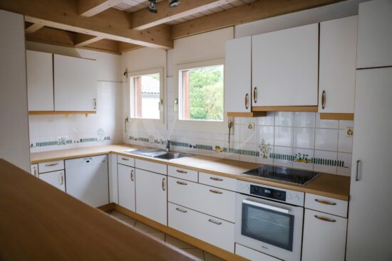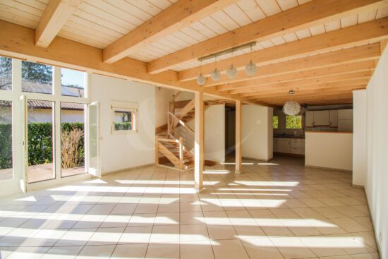 Le rez-de-chaussée se compose d’un hall d’entrée avec WC visiteurs, une cuisine équipée ouverte sur le salon / salle à manger, ce bel espace de vie bénéficiant d’une généreuse luminosité grâce à de grandes fenêtres donnant accès sur le jardin arboré.